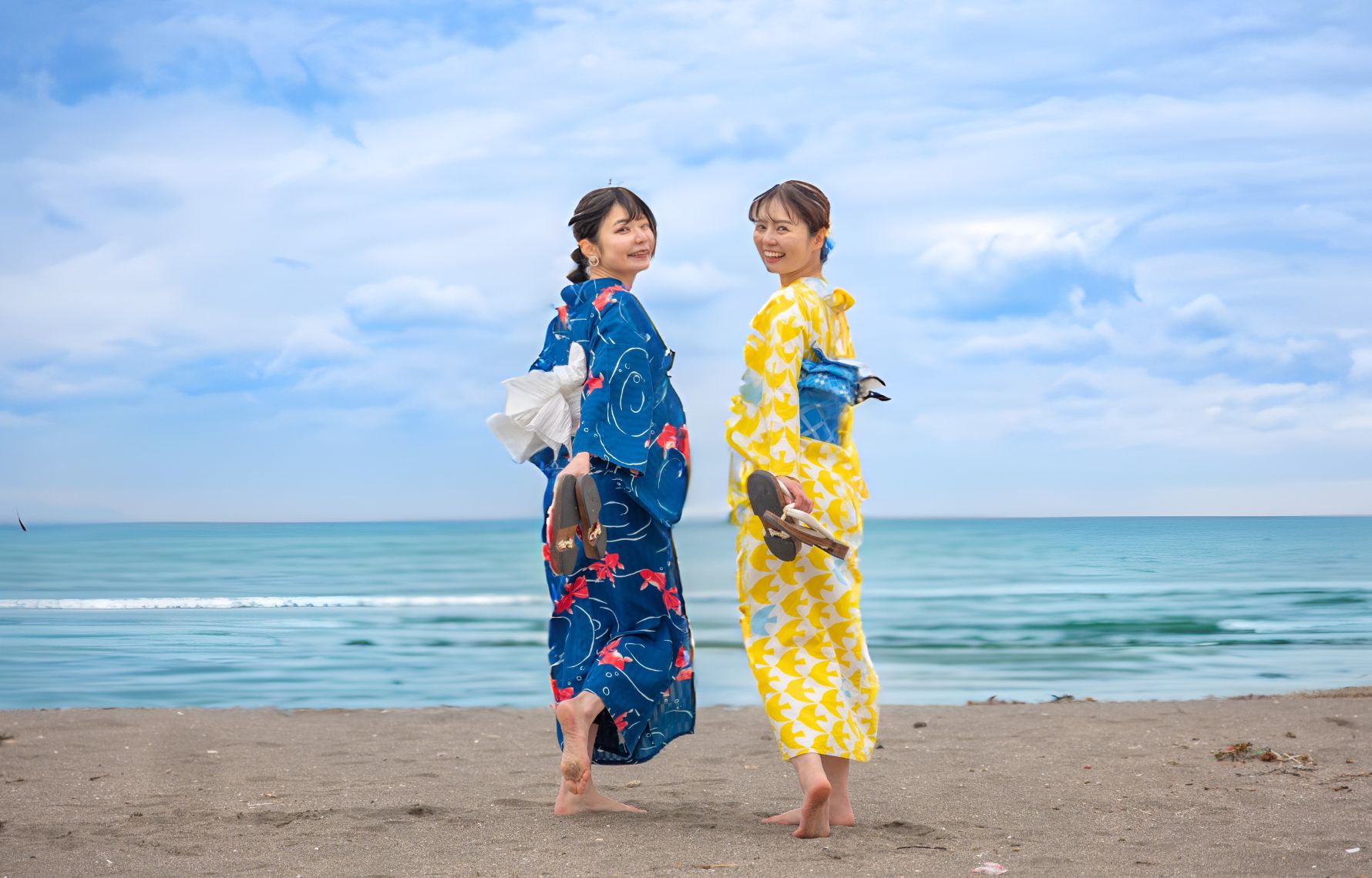 夏の鎌倉にぴったりな涼しげな浴衣。観光や花火大会、海辺の散策にもおすすめ。簡単に着付けできて、気軽に和の雰囲気を楽しめます。